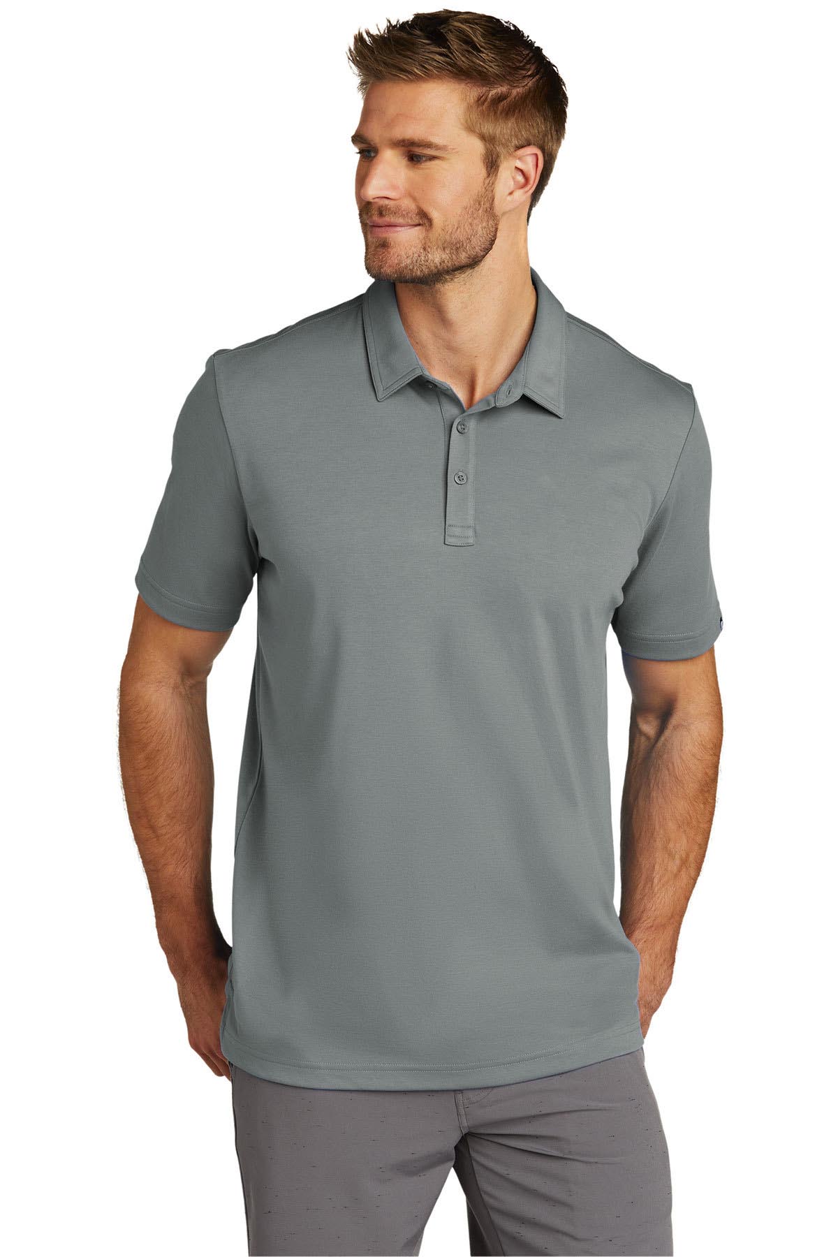 - Three-button placket with dyed-to-match buttons